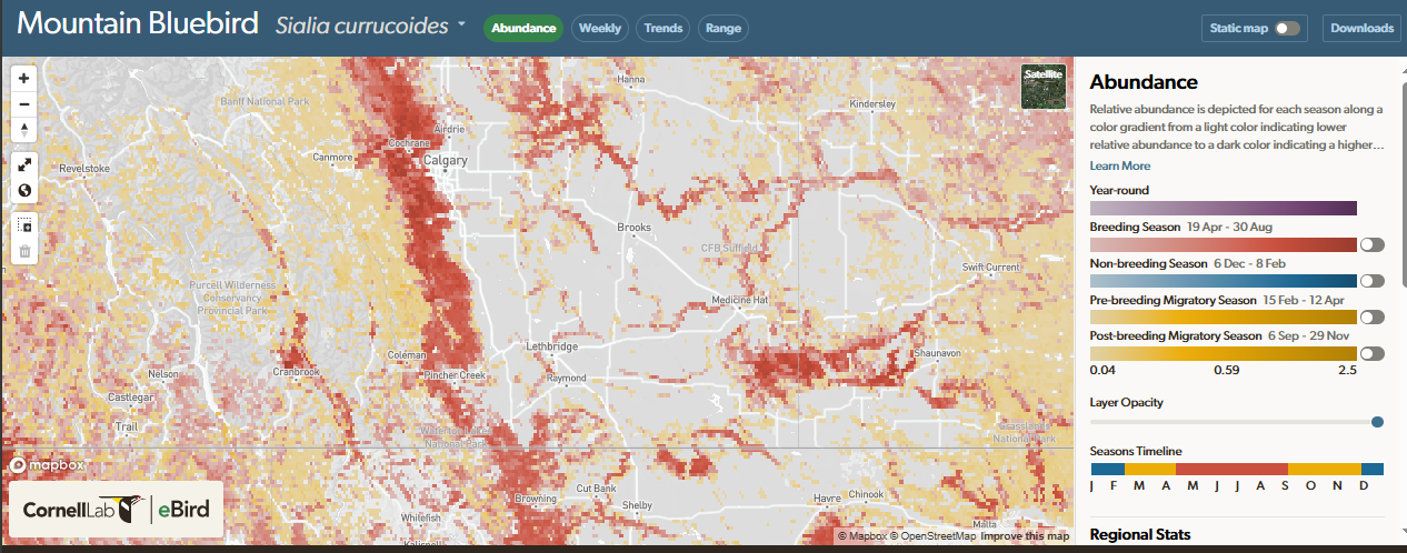 Mountain Bluebird breeding season abundance map on eBird confirms Southern Alberta as a notable breeding area.