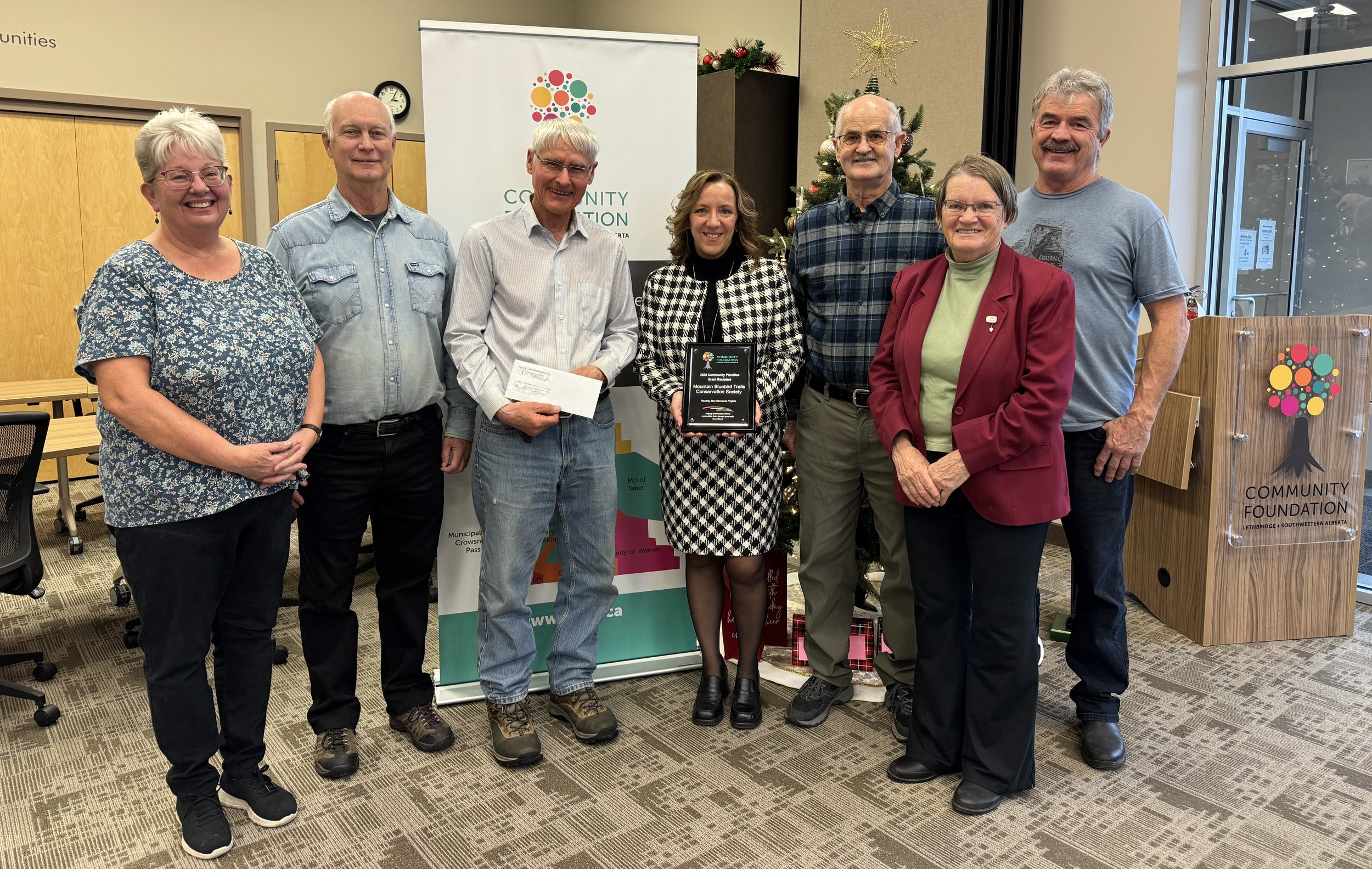 Representatives of the Mountain Bluebird Trails Conservation Society receive grant funding from the Community Foundation of Lethbridge and Southwestern Alberta to support Mountain Bluebird conservation projects.