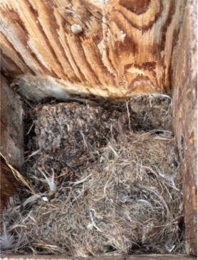 Since deer mice are carriers of Hantavirus, it is very important not to inhale any of the abundant dust from the material in the box as it is removed. It usually contains not only nesting material but feces, urine, and seeds from the nearby fields. I stand upwind of the box and poke out the material through the open drop bottom. To minimize the dust after, the entire box should be soaked with a bleach/water solution before it is scraped clean.